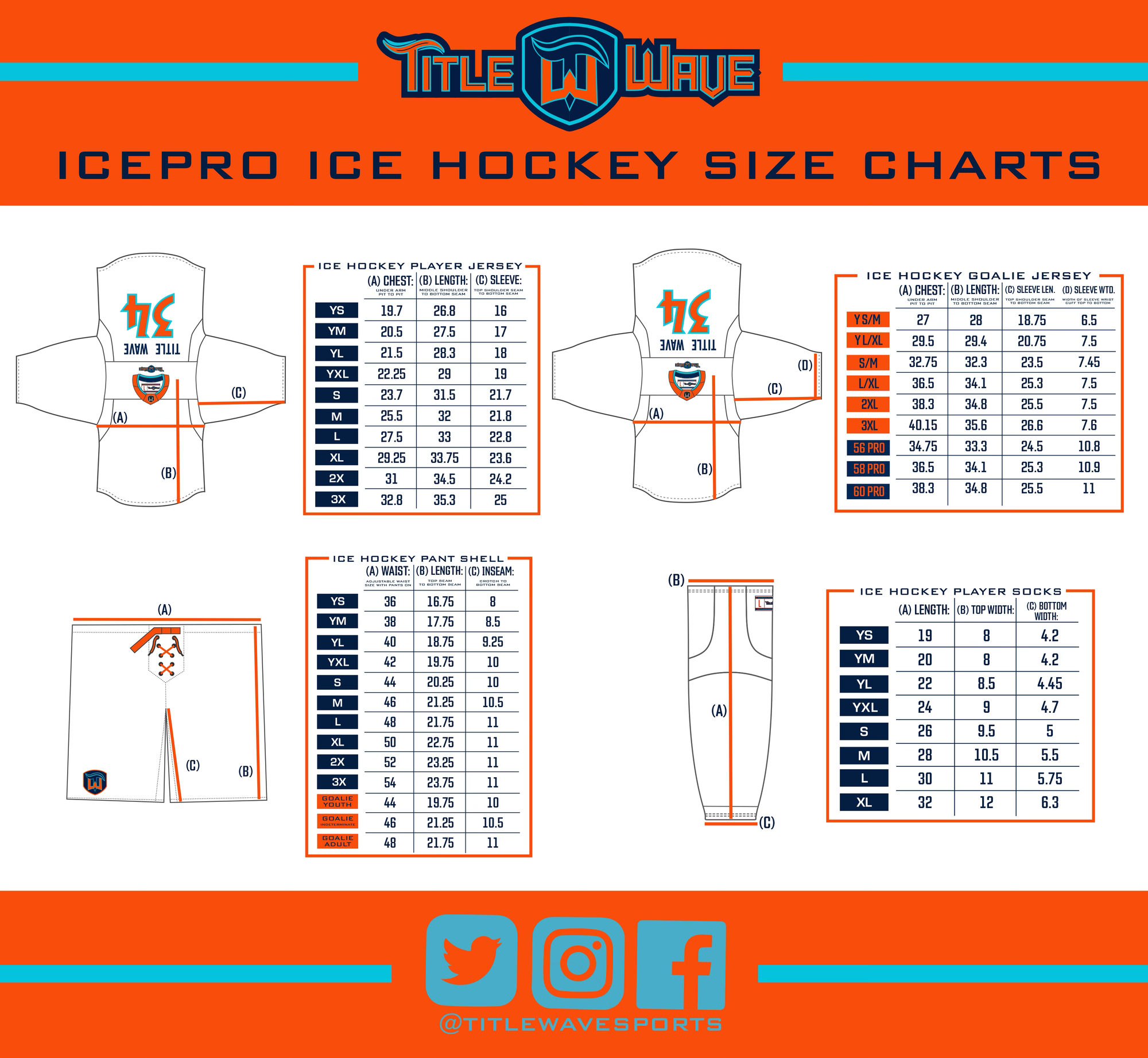 Before you lock in your jersey and sock size selections, check out the TitleWave chart below, to make sure your athlete's gear fits just right. No exchanges - so get it right, and get ready to shine at the Fargo FaceOff!