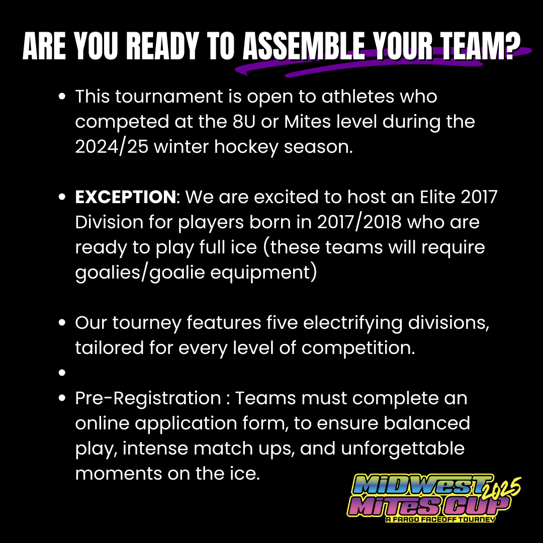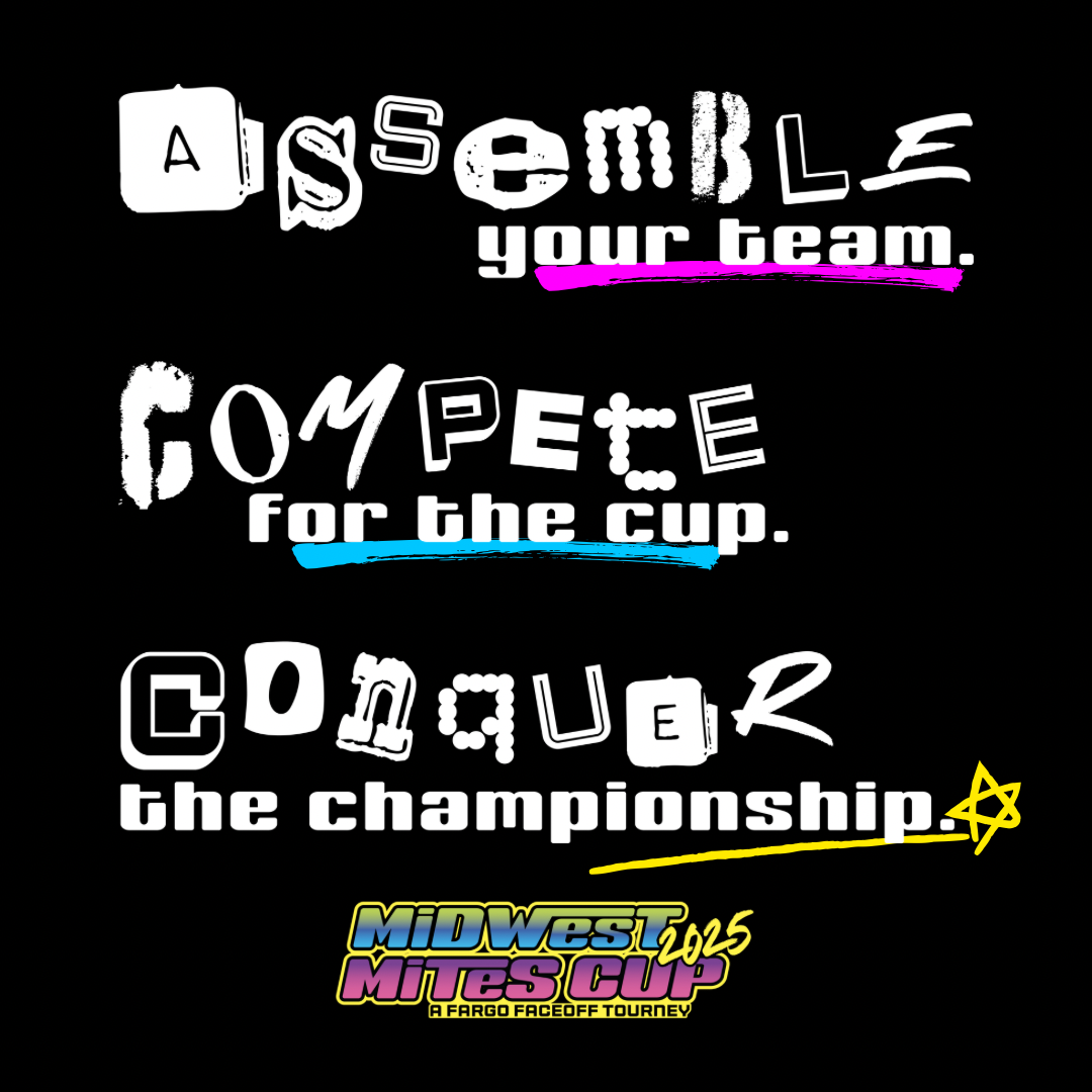 Assemble your team, hit the ice, and get ready for the ultimate hockey experience! The Midwest Mites Cup is your chance to Compete for the iconic Candy Cup, and Conquer the regional championship title, in a high-energy tournament designed for young athletes and their families. Fueled by the generosity of local businesses, volunteers, and hockey families, The Fargo FaceOff is proud to present the 2025 Midwest Mites Cup. More than a tournament, this is where friendships start, families bond, and hockey legends are made. See you at the Rink!